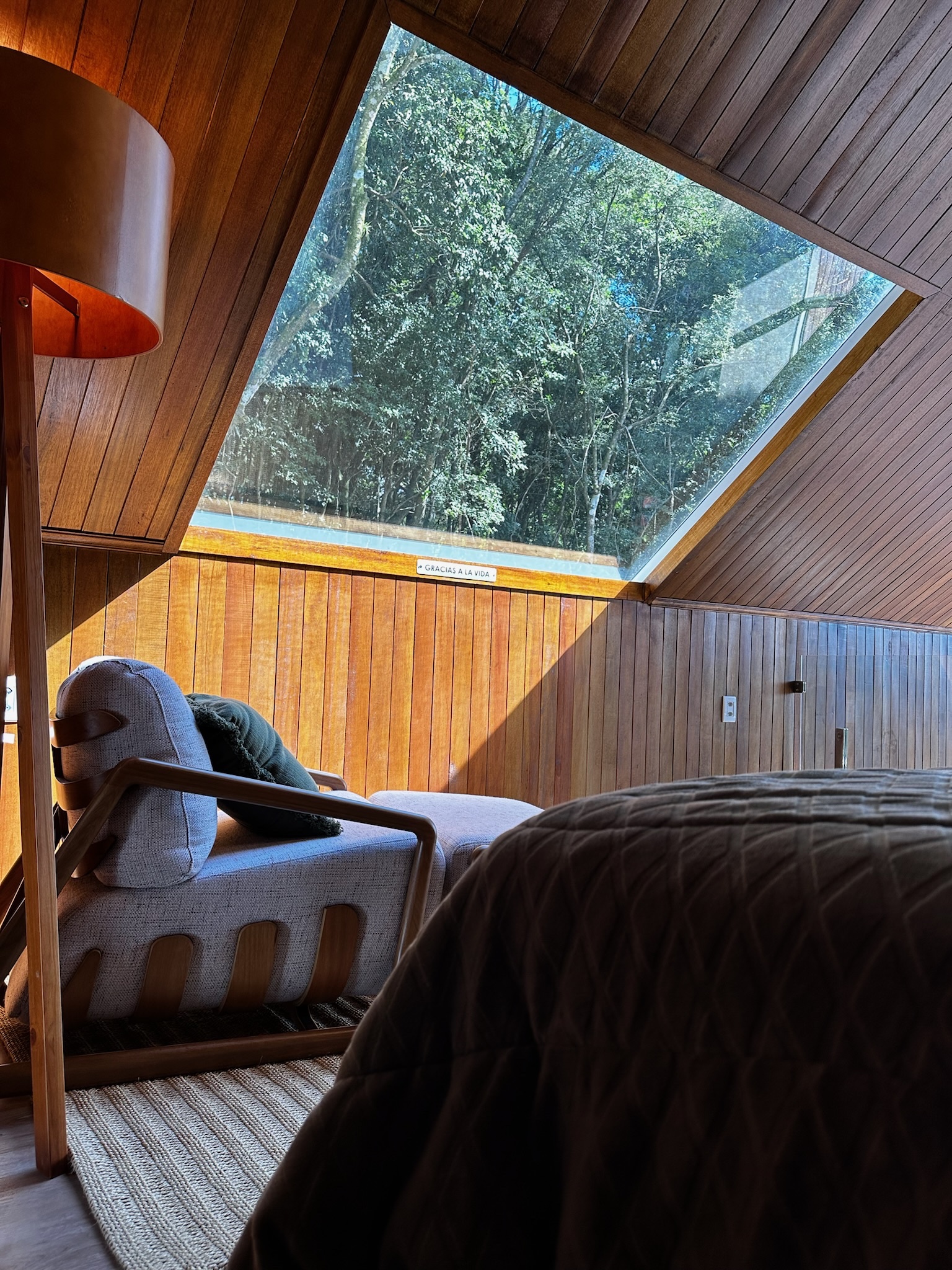 Aconchego elevado com sotão íntimo e forro inclinado. Uma cabana que abraça com luz natural generosa, lareira crepitante e imersão total na mata nativa.